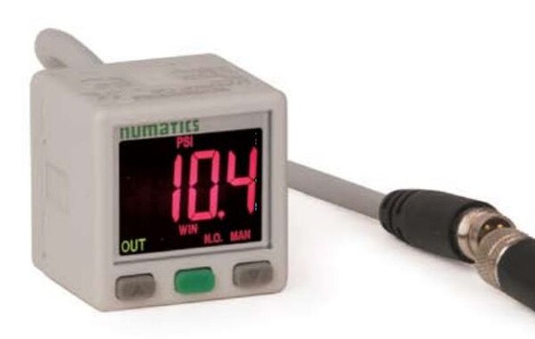 Numatics DPS / DVS 280 series digital sensors can be used as a digital pressure / vacuum gauge for accurate visual display of the current value. It can also be used as a controls device designed for applications requiring extremely accurate measurement of a specific value, then generating a digital input to the PLC or controls system. The large LCD display is easy to view. It changes color indicating the set point is achieved, causing the digital output to change state. Other features include quick response ( 2.5 ms or less), repeatable to ± 0.2 % of full scale ± 1 digit, raised set buttons for simple intuitive programming of the hysteresis or window comparator modes of operation. Applications include verification of part present, quality assurance using decay leak testing, control of edges on film winding, clamping forces, evacuate and fill circuits, pump up and down circuits and many more.