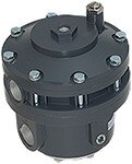 A pneumatic or compressed air volume booster reproduces a low flow control signal with a higher regulated flow output pressure.